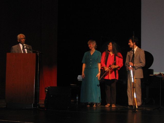 Dr. Noel Brown, president of the Friends of the United Nations, thanks performers Marjorie, Mary Youngblood and Michael Arnowitt at the conclusion of their March 22, 2007 World Water Day concert at the Mahaffey Theater in St. Petersburg. Photo by Mary Sturdevant.