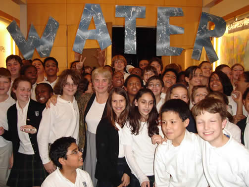 November 6-10, 2006: St. Hilda's & St. Hugh's School in New York City held a major "Water Week." All grades of the school studied water from across all academic disciplines during the week, and Marjorie served as teacher and guest of honor throughout. In every single hour of the entire week, St. Hilda's & St. Hugh's students and teachers accomplished a vast, in-depth, multi-disciplinary study of water. Academic activities included studies of water in the fields of music, art, science, religion, English, history, physical education, math, Latin, French, Mandarin Chinese and all the other disciplines taught in this exceptional Upper West Side school, and also included the school's students in nursery school and junior and senior kindergarten. The sounds of waves, rushing rivers, rain, and water-inspired music filled the school lobby every day on the PA system; posters and art works and sculpture inspired by water decorated the walls and halls. One art class built a bathtub-sized, multi-tiered water fountain that will soon be on display inside the school's front doors. Below are photographs from the week by artist and art teacher Mary Ann Holiday and school photographer Jonathan Goti.