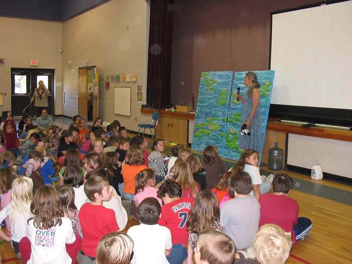 October 6-10, 2008: Water Week at Randolph Elementary School, as Randolph joins other Vermont schools in a celebration called the Year of Water. Marjorie taught all grade levels during the week. The kindergartners took a pledge to protect water for the rest of their lives. The first graders made "earth necklaces" with one special, hand-crafted bead representing the Earth's only fresh water. Other students made posters representing the number of gallons needed to produce food. For example, it takes between 800-1300 gallons of water to make one hamburger.Filmmaker Joe DeFelice came and filmed the opening assembly. Composer and Water Music musician Mary Elizabeth attended the final Friday assembly, where the children sang her song that they had learned, "There is Only One Water." More details of the Year of Water can be found under News and Events on this web site..
