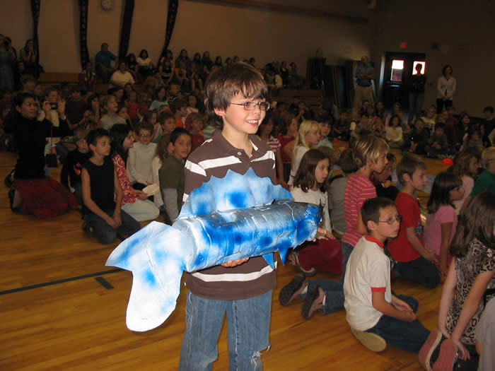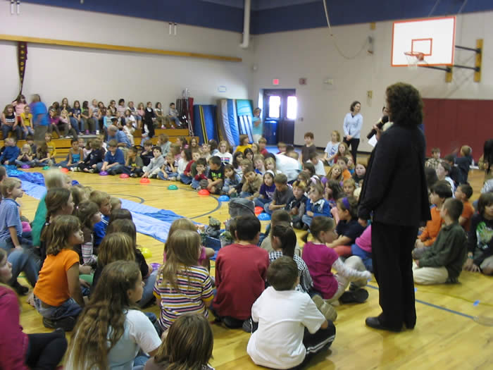 October 6-10, 2008: Water Week at Randolph Elementary School, as Randolph joins other Vermont schools in a celebration called the Year of Water. Marjorie taught all grade levels during the week. The kindergartners took a pledge to protect water for the rest of their lives. The first graders made "earth necklaces" with one special, hand-crafted bead representing the Earth's only fresh water. Other students made posters representing the number of gallons needed to produce food. For example, it takes between 800-1300 gallons of water to make one hamburger.Filmmaker Joe DeFelice came and filmed the opening assembly. Composer and Water Music musician Mary Elizabeth attended the final Friday assembly, where the children sang her song that they had learned, "There is Only One Water." More details of the Year of Water can be found under News and Events on this web site..
