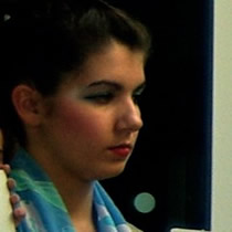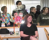 Student composer Holly Mudford (seated) listens to the live performance of her composition, "Shadows on the Water" in the State House cafeteria, March 24. Other students and family members listen behind her.