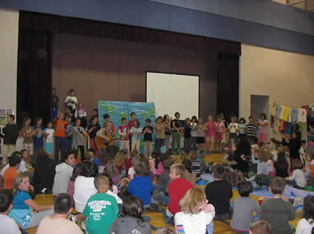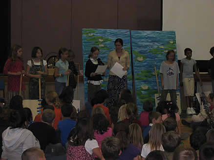 | During an assembly about water held at Randolph Elementary School, students perform an original play about the building of a reservoir and the human and community costs associated with it. They are guided by fifth/sixth-grade teacher Lindsay Meyer. |
